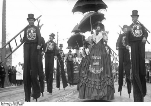 Eine große Attraktion - vornehmlich für uns Kinder - war immer der riesige Nigrin-Mann auf seinen hohen Stelzen. Nigrin und Erdal, das waren die beiden bedeutendsten Schuhcrememarken dieser Zeit. Den Konkurrenzkampf gewann schließlich Erdal, deren Markenzeichen der rote Frosch war, während Nigrin vom Markt verschwand. Ausgerechnet Nigrin, deren Symbol der schwarze Stelzenmann mit weiter Zimmermannshose und Zylinder war, und der uns soviel Spaß machte, den wir bei seinen Reklame-Siebenmeilenschritten umringten und folgten. Zu unserem Kummer verschwand er mit der Zeit und versank im Dunkel der Vergangenheit.